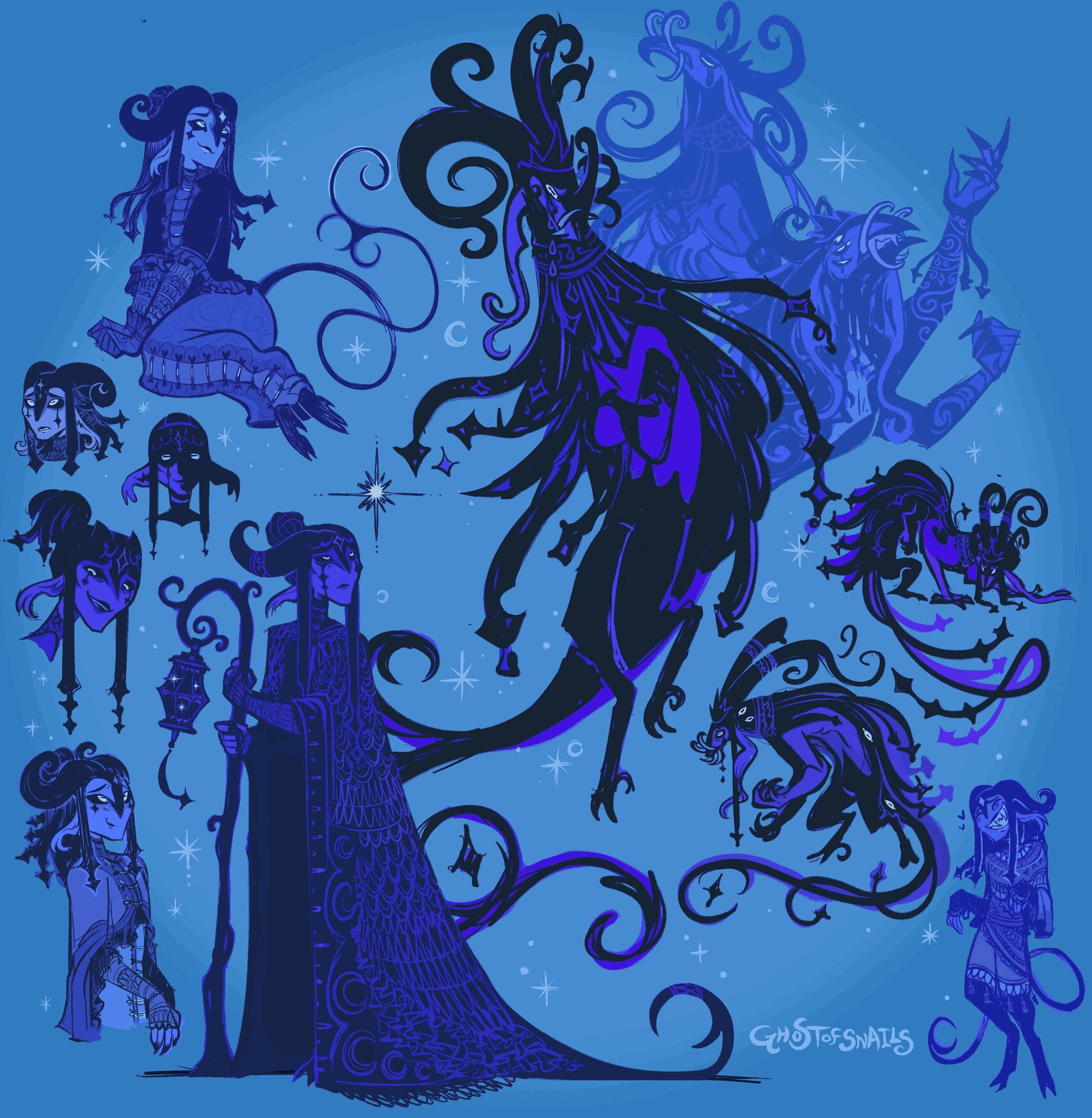 sketchpage of my sona with various poses and expressions. sparkles abound